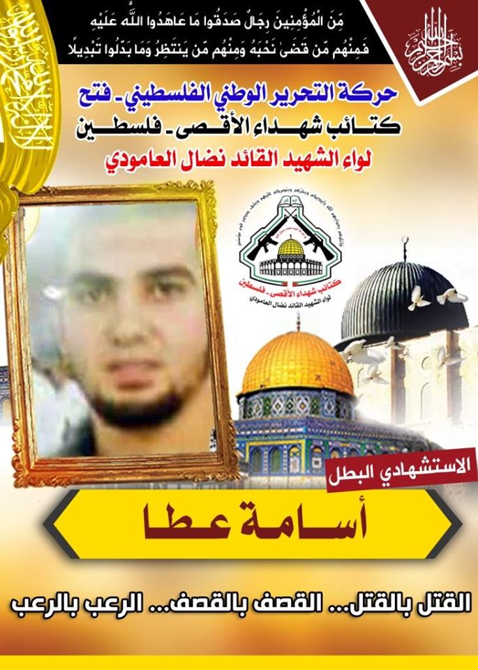 الإستشهادى المجاهد "أسامة أحمد عطا "،أحد مجاهدى حركة التحرير الوطنى الفلسطينى " فتح " الذي إرتقى شهيداً بعد أن نفذ عملية إستشهادية بطولية مزدوجة فى منطقة باب العامود بالقدس المحتلة بتاريخ 16.6.2017م.