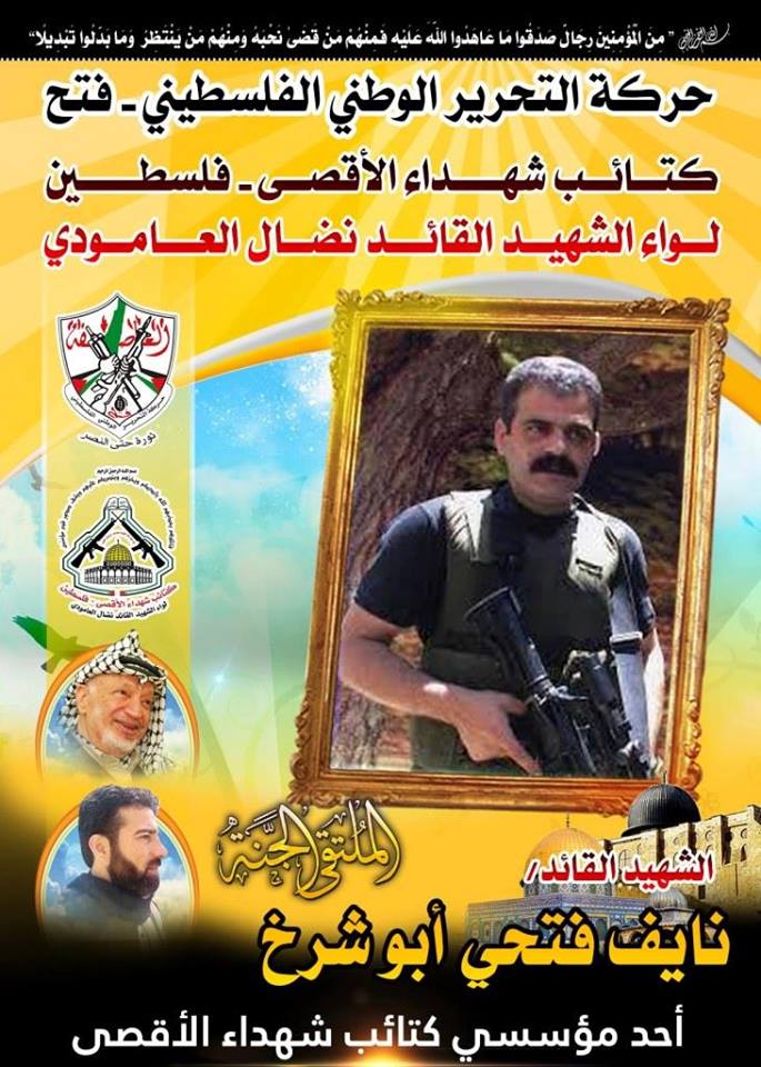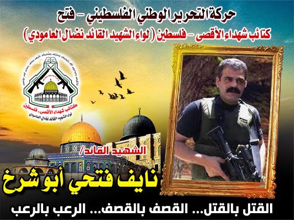 فإننا اليوم في كتائب شهداء الأقصى - فلسطين لواء الشهيد القائد " نضال العامودي" ننحني إجلالاً وإكباراً لروح شهيدنا القائد المجاهد، نايف أبو شرخ ورفاقه الأبطال، مجددين العهد والقسم مع الله ثم لدمائهم الذكية، بان نمضي قدماً على طريقهم النضالي الذي مضى وقضى عليه خيرة أبناء شعبنا من الشهداء العظام .