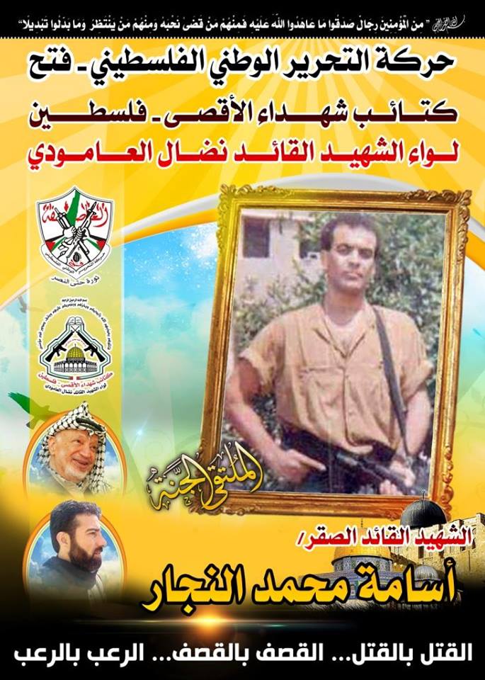 فإننا اليوم في كتائب شهداء الأقصى - فلسطين لواء الشهيد القائد " نضال العامودي"،ننحني إجلالاً وإكباراً لروح شهيدنا القائد، إسامة النجار، مجددين العهد والقسم مع الله ثم لدمائهم الذكية، بان نمضي قدماً على طريقهم النضالي الذي مضى وقضى عليه خيرة أبناء شعبنا من الشهداء العظام .