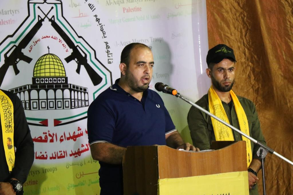 وألقى القائد "أبو كنان" كلمة كتائب الأقصى لواء العامودي، أكد فيها نحن اليوم نقف موقف عزاً وفخر وتقدير للعائلة التي ربت ابنها على حب النضال والكفاح المسلح والتضحية في سبيل الله ثم الوطن.
