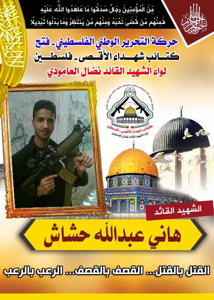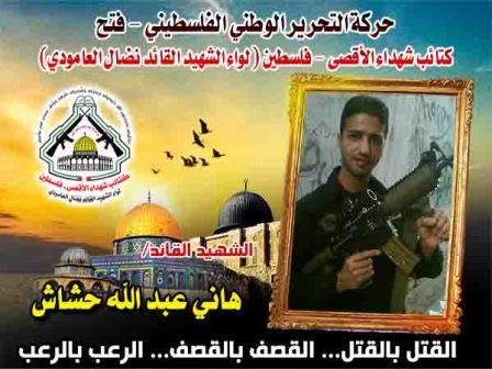فإننا اليوم فى كتائب شهداء الأقصى - فلسطين لواء الشهيد القائد " نضال العامودي " لن ندع هذه الذكرى العطرة أن تمر مرور الكرام دون أن نضع لمسات من الوفاء لروح الشهيد القائد المجاهد " هانى حشاش " الذي نحيي اليوم ذكراه ونؤكد بأننا لن ننساه وسيبقى متربعاً في قلوبنا حتى نلقاه… شهداء على ذات الدرب بإذن الله .