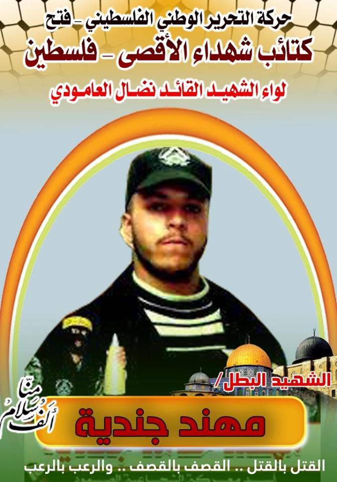 فإننا اليوم في كتائب شهداء الأقصى - فلسطين لواء الشهيد القائد " نضال العامودي "،نبرق بتحية إجلال وإكبار لروح شهيدنا المجاهد، مهند جندية ، في ذكرى إستشهاده ونؤكد بأن مرور السنوات لن تمسح ذكرى الشهداء من ذاكرتُنا الوطنية الحية.