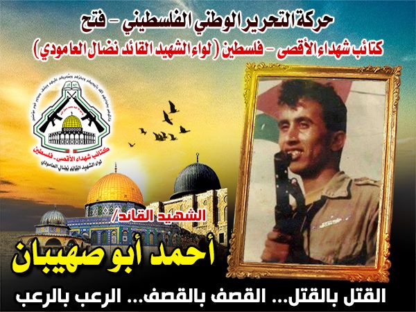 فإننا اليوم في كتائب شهداء الأقصى - فلسطين لواء الشهيد القائد " نضال العامودي "،ننحني إجلالاً وإكباراً لروح شهيدنا القائد الصقر " أحمد أبو صهيبان " مجددين العهد والقسم مع الله ثم لدمائهم الذكية، بان نمضي قدماً على طريقهم النضالي الذي مضى وقضى عليه خيرة أبناء شعبنا من الشهداء العظام .
