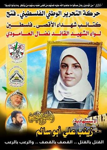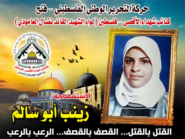 فإننا اليوم فى " كتائب شهداء الأقصى "- فلسطين لواء الشهيد القائد " نضال العامودي " ،ننحني إجلالاً وإكباراً لروح ماجدة فلسطين ، " زينب على أبو سالم "، التي قدمت في مثل هذا اليوم من العام 2004م، نموذجاً حياً لما تعيشه المرأة الفلسطينية وسطرت بدمائها الذكية أروع ملاحم التضحية والفداء ، في زمن الخنوع والركوع العربي الذي أصبحت المرأة الفلسطينية فيه تدافع عن كرامة الأمة المهزومة .