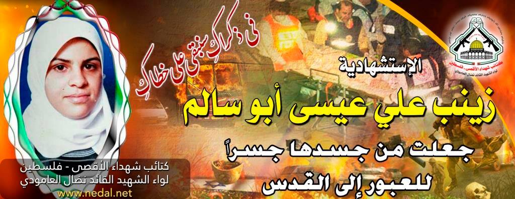 يصادف اليوم الثاني والعشرون من شهر سبتمبر الذكرى السنوية لإستشهاد إبنة كتائب شهداء الأقصى الذراع العسكرى لحركة التحرير الوطنى الفلسطينى " فتح " المجاهدة البطلة، زينب علي عيسى أبو سالم، من سكان مخيم عسكر القديم شرق مدينة نابلس، ومنفذة العملية الإستشهادية الفدائية البطولية بعدد من جنود الإحتلال بالقرب من محطة انتظارٍ للجنود الصهاينة المسافرين مجانـًا في سيارات خصوصية إلى منطقة البحر الميّت ومستوطنة “معليه أدوميم” مما أسفر عن مقتل جندي ومستوطن وإصابة ستة عشرة اخرين بجراح متفاوتة .