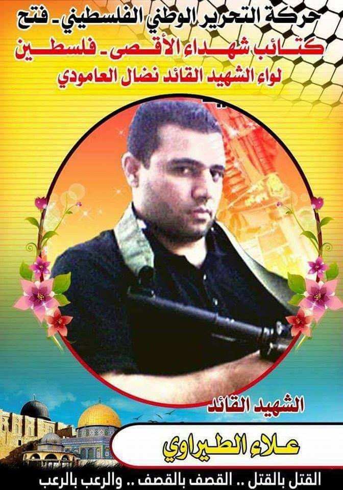 فإننا اليوم في كتائب شهداء الأقصى – فلسطين لواء الشهيد القائد " نضال العامودي " ،ننحني إجلالاً وإكباراً لروح الشهيد علاء الطيراوي التي شهدت دماءه على إجرام المحتل بحق الإنسانية مجددين العهد والقسم مع الله عزوجل ولروحه الطاهرة، بأن نمضى قدماً على طريق النضال الذي مضى وقضى عليه شهيدنا المغوار .