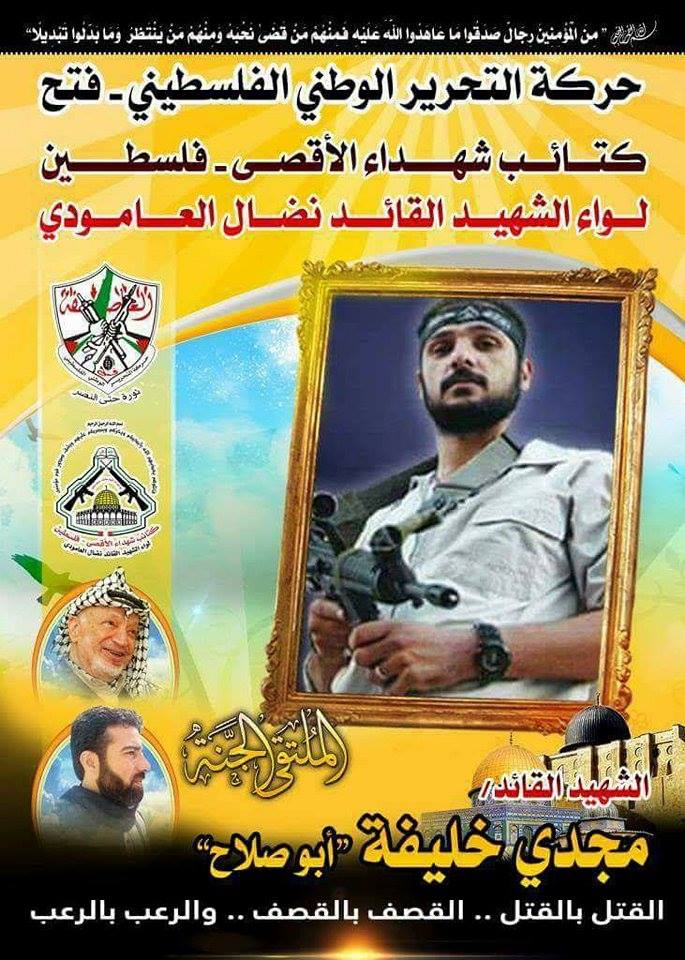 فإننا اليوم في كتائب شهداء الأقصى - فلسطين لواء الشهيد القائد " نضال العامودي" ننحني إجلالاً وإكباراً لروح شهيدنا القائد " مجدى خليفة، مجددين العهد والقسم مع الله ثم لدمائهم الذكية، بأن نمضي قدماً على طريقهم النضالي الذي مضى وقضى عليه خيرة أبناء شعبنا من الشهداء العظام .