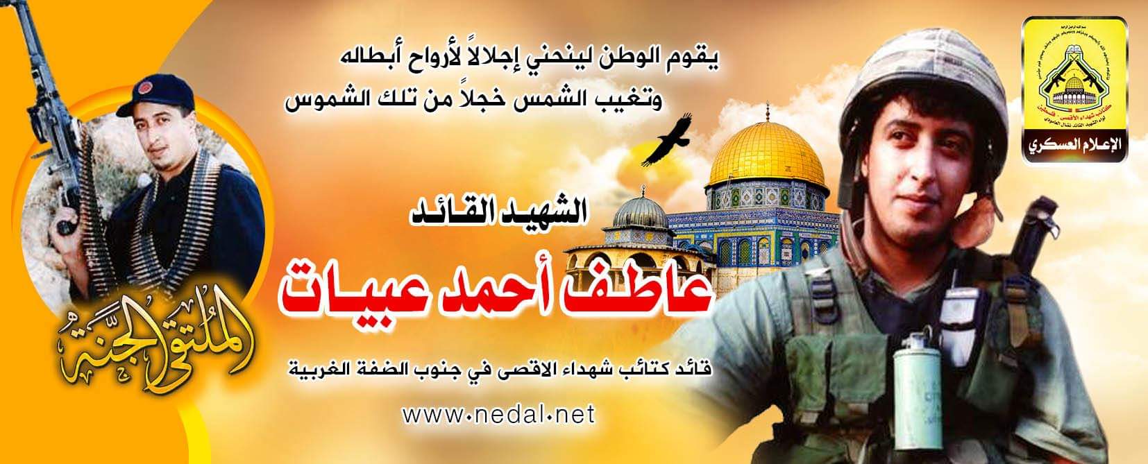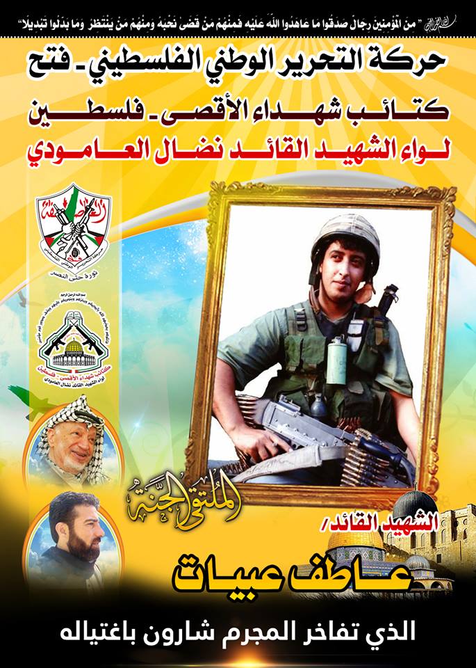 فإننا اليوم في كتائب شهداء الأقصى - فلسطين لواء الشهيد القائد " نضال العامودي " ننحني إجلالاً وإكباراً لروح شهيدنا القائد المجاهد، عاطف عبيات ، مجددين العهد والقسم مع الله ثم لدمائهم الذكية، بان نمضي قدماً على طريقهم النضالي الذي مضى وقضى عليه خيرة أبناء شعبنا من الشهداء العظام .