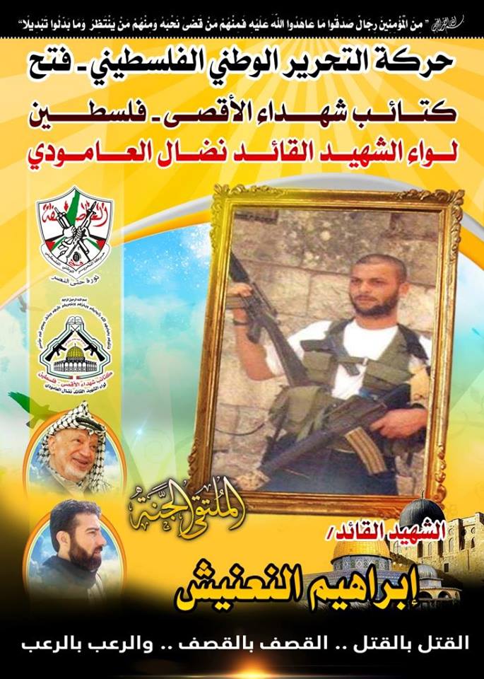 فإننا اليوم فى كتائب شهداء الأقصى – فلسطين لواء الشهيد القائد " نضال العامودي "،نحُيى ذكرى إستشهاد المجاهد إبراهيم النعنيش ، مجددين العهد والقسم مع الله عزوجل ولروحه الطاهرة، بأن نمضى قدماً على طريق النضال الذي مضى وقضى عليه شهيدنا المغوار.