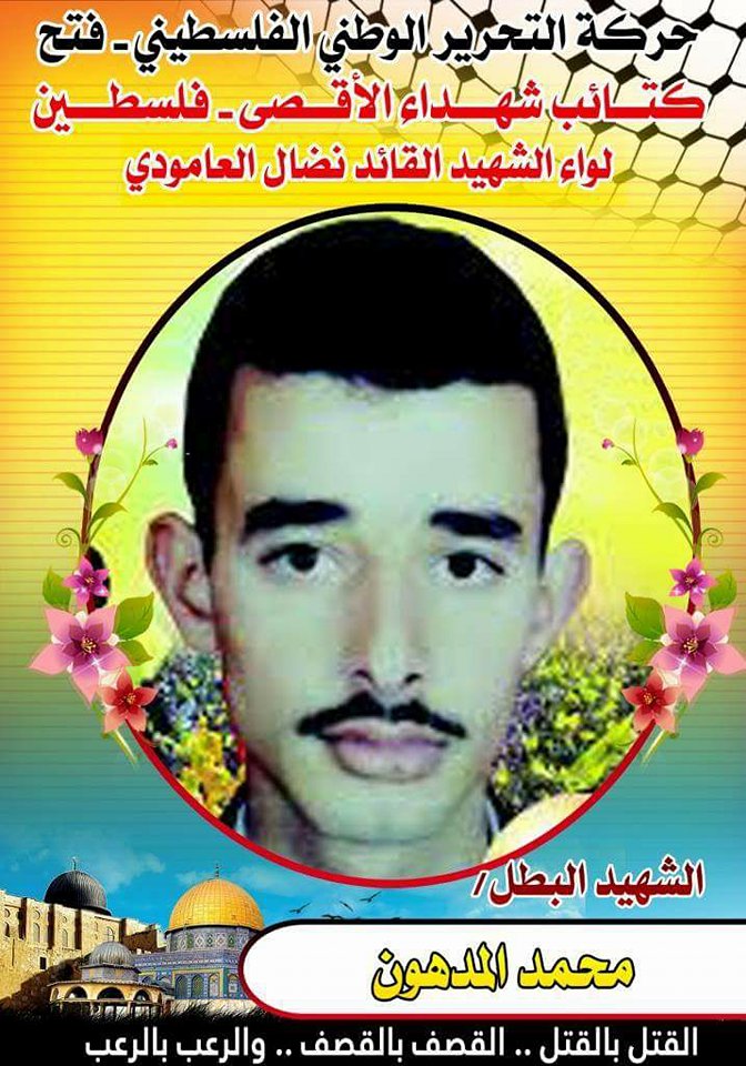 فإننا اليوم في كتائب شهداء الأقصى - فلسطين لواء الشهيد القائد " نضال العامودي " ننحني إجلالاً وإكباراً لروح شهيدنا المجاهد" محمد المدهون "، مجددين العهد والقسم مع الله ثم لدمائهم الذكية، بأن نمضي قدماً على طريقهم النضالي الذي مضى وقضى عليه خيرة أبناء شعبنا من الشهداء العظام .