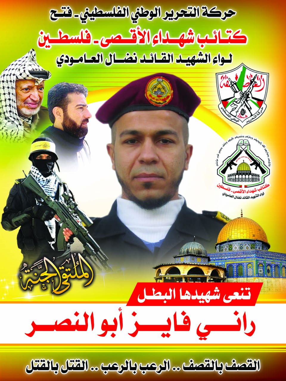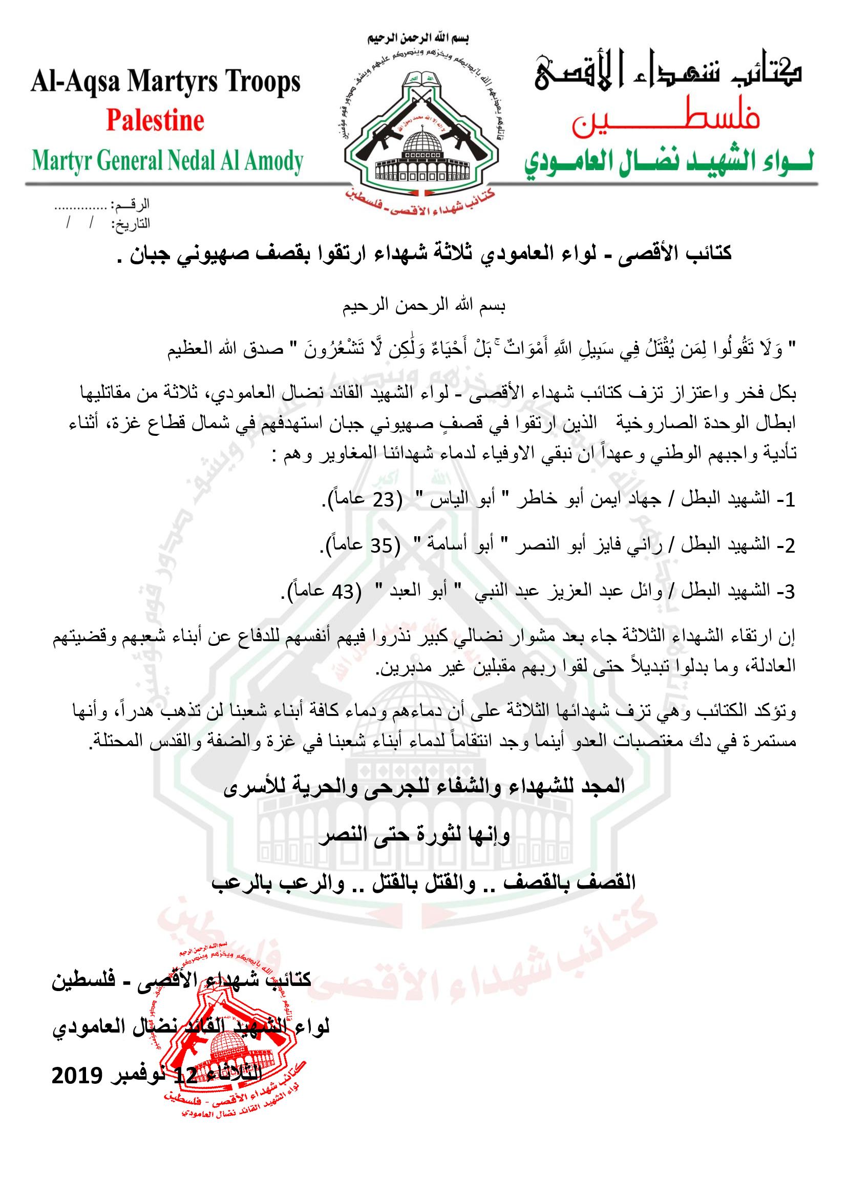 بكل فخر واعتزاز تزف كتائب شهداء الأقصى - لواء الشهيد القائد نضال العامودي، ثلاثة من مقاتليها ابطال الوحدة الصاروخية الذين ارتقوا في قصفٍ صهيوني جبان استهدفهم في شمال قطاع غزة، أثناء تأدية واجبهم الوطني وعهداً ان نبقي الاوفياء لدماء شهدائنا المغاوير وهم :