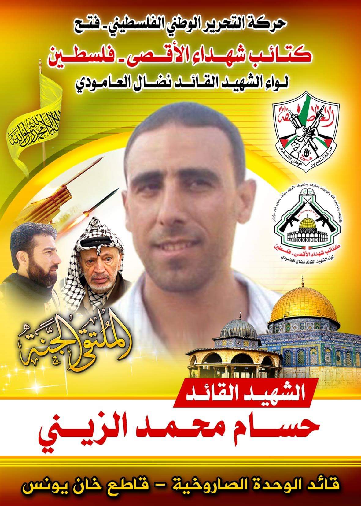 لله در الرجال الذين وهبوا أرواحهم رخيصة لله عز وجل ، ولله در العظماء الذين تركوا الدنيا وراء ظهورهم وهاجروا إلى الله ورسوله ، تاركين ورائهم متاع الدنيا ، لتخرج مجموعة مشتركة من كتائب الأقصى " لواء العامودي" وسرايا القدس متسلحين بالإيمان والعقيدة ويدكون حصون المحتل بالصواريخ المباركة ، و يتصدون لهذا المحتل الغاشم فهؤلاء المقاتلين الأشداء على عدوهملم يعرفوا للإستكانة مكان ، لتباغتهم طائرات الحقد الصهيونية بصاروخ جعل من أجسادهم الطاهرة أشلاء وروت دمائهم الذكية أرض الوطن ليتلحقوا بركب الشهداء والأنبياء والصديقين نحسبهم كذلك ولا نزكي على الله أحداً ، فإستشهد القائد الصنديد والفارس العنيد " حسام الزيني" ، إبن مخيم خان يونس ، قائد الوحدة الصاروخية لكتائب شهداء الأقصى - فلسطين " لواء العامودي" في محافظة خان يونس، والشهداء الأبطال " محمود شعث وسيف صادرق "، أبناء سرايا القدس الجناح العسكري لحركة الجهاد الإسلامي .