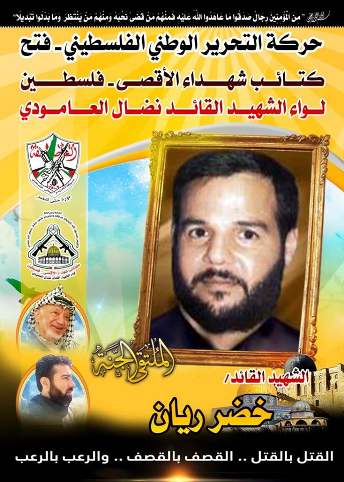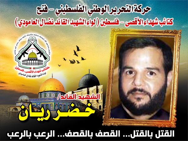 فإننا اليوم في كتائب شهداء الأقصى - فلسطين لواء الشهيد القائد " نضال العامودي " نحُيى ذكرى الشهيد القائد " خضر ريان "،مجددين العهد والبعية مع الله عزوجل بأن نمضي على قدما على طريق الشهداء ونعاهد أرواحهم الطاهرة بأن نكون الأوفياء لدماؤهم الذكية التي روت ثرى أرض فلسطين الحبيبة.