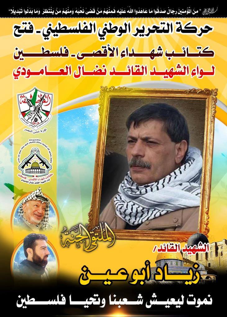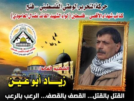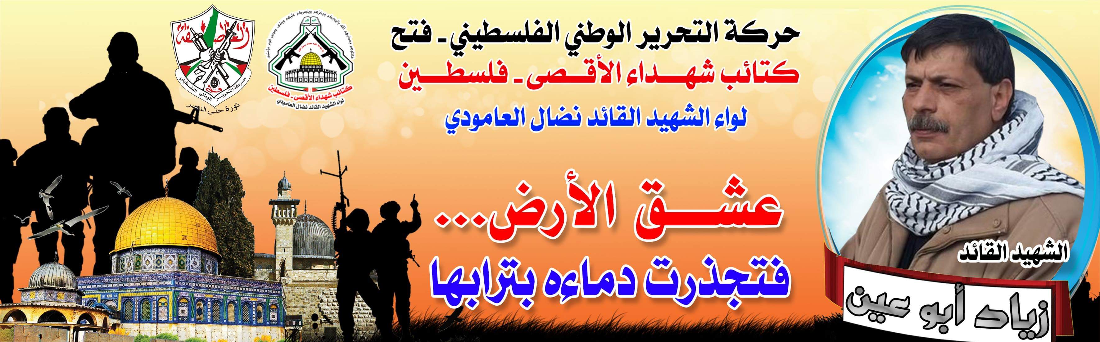 فإننا اليوم في كتائب شهداء الأقصى – فلسطين لواء الشهيد القائد " نضال العامودي "، نحُيى ذكرى إستشهاد قائد فلسطيني كبير ترجم إنتماءه لفلسطين ولقضيته من خلال مسيرة نضالية طويلة تُوجَ فصولها الأخيرة بالشهادة، مجددين العهد والقسم مع الله بأن نمضى قُدماً على الطريق النضالي الذي مضى وقضى عليه الشهيد القائد الوطنى الكبير "زياد أبوعين " وقافلة شهداء فلسطين الأبطال .