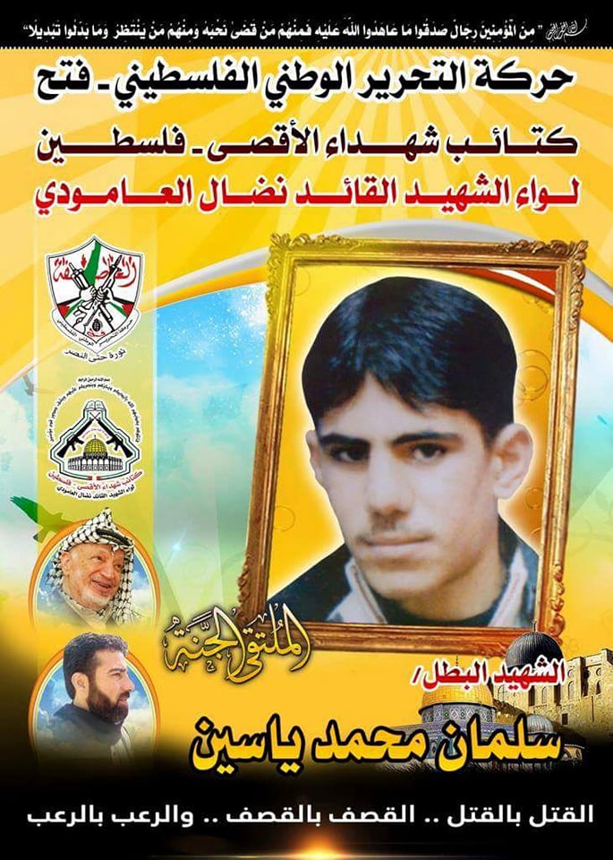 فإننا اليوم في كتائب شهداء الأقصى – فلسطين لواء الشهيد القائد " نضال العامودي" نستذكر شهيدنا المجاهد سليمان ياسين, ونجدد العهد والقسم لروحه الطاهرة في ذكرى إستشهاده التي ستبقى خالدة في قلوب كل الشرفاء.