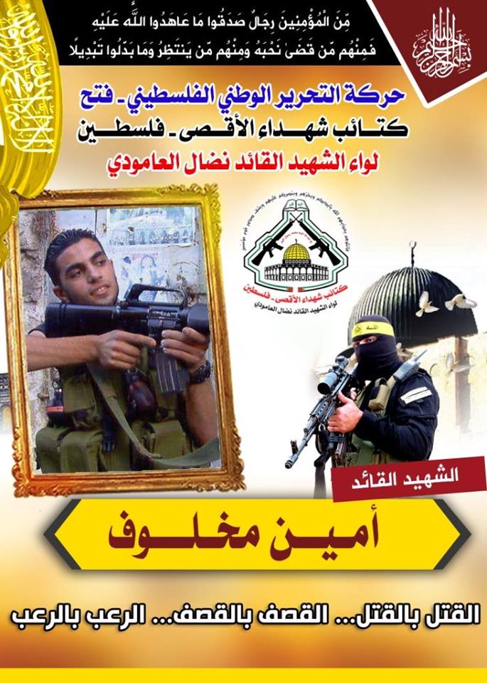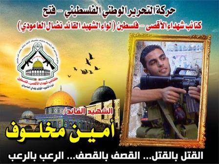 فإننا اليوم في كتائب شهداء الأقصى - فلسطين لــواء الشهيد القائد " نضال العامودي" نحيي ذكرى إستشهاد المجاهد، أمين مخلوف معاهدين روحه الطاهرة بأن نمضي قدماً على طريق الجهادِ والكفاح المسلح حتى تحرير اخر شبر من أرض فلسطين الحبيبة التي سقط لأجلها الآف الشهداء.