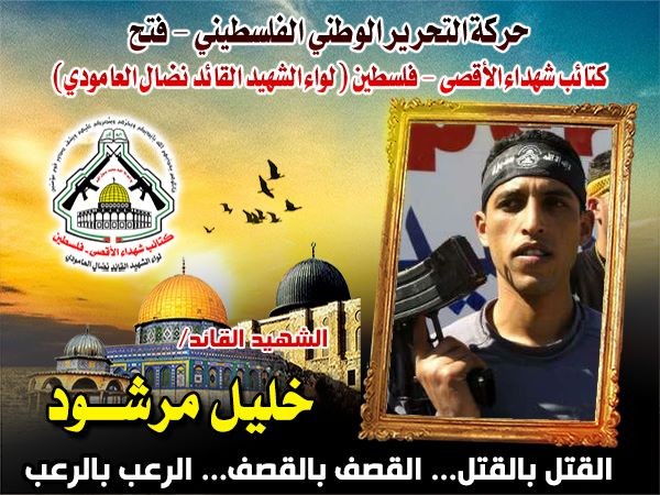 فإننا اليوم في كتائب شهداء الأقصى - فلسطين لواء الشهيد القائد " نضال العامودي"، نبرق بتحية إجلال وإكبار لروح شهيدنا القائد " خليل مرشود " في ذكرى إستشهاده .