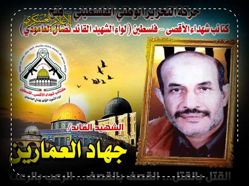 فإننا اليوم في كتائب شهداء الأقصى – فلسطين لواء الشهيد القائد " نضال العامودي"، نحُيى ذكرى إستشهاد قائد فلسطيني كبير ترجم إنتماءه لفلسطين ولقضيته من خلال مسيرة نضالية طويلة تُوجَ فصولها الأخيرة بالشهادة، مجددين العهد والقسم لروحه الطاهرة بأن نمضى قُدماً على الطريق النضالي الذي مضى وقضى عليه الشهيد القائد "جهاد العمارين "،وقافلة الشهداء الأبطال .