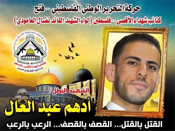 فإننا اليوم في كتائب شهداء الأقصى – فلسطين لواء الشهيد القائد " نضال العامودي "، نحيي ذكرى إستشهاد  الشهيد المجاهد  " أدهم محمد عبد العال " وإذ ننحنى إجلالاً وإكباراً لروح شهيدنا المجاهد في ذكرى إستشهاده ونعاهد الله أن نبقى الأوفياء لدمائه الطاهرة التي روت أرض فلسطين .