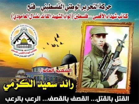 تحل علينا اليوم الرابع عشر من شهر يناير الذكرى السنوية لإستشهاد قائدنا ومعلمنا ومؤسس كتائبنا العملاقة التي إستطاعت خلال سنوات الإنتفاضة إدخال الرعب إلي قلب كل صهيوني إستباحَ أرضنا بغير حق الشهيد " رائد سعيد الكرمى " صقر الكتائب صاحب الرد السريع ،أحد أبرز القادة المؤسسين لكتائب شهداء الأقصى الذراع العسكرى لحركة التحرير الوطنى الفلسطينى " فتح " على مستوى الوطن ،وأحد أبرز قادة المقاومة الفلسطينة المطلوبين للكيان الصهيونى الهش الذى إغتالته العدو الصهيونى بتاريخ 14.1.2002م.