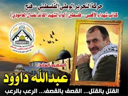 فإننا اليوم في كتائب شهداء الأقصى – فلسطين لواء الشهيد القائد " نضال العامودي"، نحُيى ذكرى إستشهاد القائد المجاهد اللواء ،" عبدالله داوود "،هذا القائد الشجاع الذي شكل رعباً للإحتلال الصهيونى طوال توليه لقيادة جهاز المخابرات العامة جراء إعطاء تعليمات مشددة لقواته بالتصدي لأي عدوان يتعرض له أبناء شعبنا البطل .