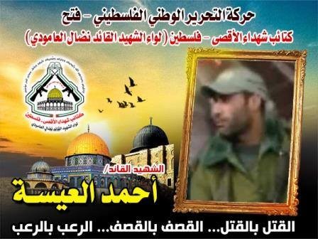 فإننا اليوم في كتائب شهداء الأقصى - فلسطين لــواء الشهيد القائد " نضال العامودي"،نستذكر شهيدنا القائد " أحمد العيسة " ونجدد العهد ووالبيعة والقسم مع الله ،ثم لروحه الطاهرة في ذكرى إستشهاده التي ستبقى خالدة في قلوب كل الشرفاء،أن نبقى على عهد الشهداء ماضون حتى النصر أو الشهادة.