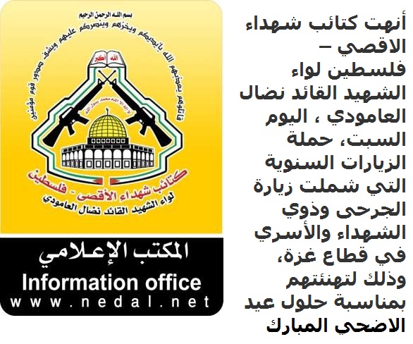 كتائب شهداء الاقصي - فلسطين تنهي حملة زيارات الجرحى وذوي الشهداء والأسرى أنهت كتائب شهداء الاقصي – فلسطين لواء الشهيد القائد نضال العامودي ، اليوم السبت، حملة الزيارات السنوية التي شملت زيارة الجرحى وذوي الشهداء والأسري في قطاع غزة، وذلك لتهنئتهم بمناسبة حلول عيد الأضحي المبارك وقد شملت الزيارات بيوت الشهداء والأسري والجرحى من أبناء الكتائب في قطاع غزة ، ومن جانبه أكد الناطق الرسمى بإسم كتائب شهداء الأقصى ، لواء الشهيد القائد نضال العامودي " أبو محمد " أن المشاركة في الزيارات تأتي من باب التواصل . وإن هذه الحملات تستهدف تعميق التواصل مع جميع أهالي الشهداء والأسري والجرحى والتي من شأنها أن تساهم في تعزيز وترسيخ مبادئ الانتماء للمقاومة الفلسطينية التي أثبتت للعالم بأسرة أن الحقوق لا تأخذ إلا بالقوة ولا تعطي مجانا . وأضاف أبو محمد: " تعتبر هذه الزيارات هي أقل القليل الذي نقدمه لأبناء شعبنا المجاهد الصابر في وجه العدوان والحصار، وتأتي وفاء وعرفاناً للشهداء والأسرى والجرحى الذين جادوا بكل ما يملكون في سبيل تحرير مقدساتهم وبلادهم . ووفاء لهم على ما قدموه من أجل قضيتهم وشعبهم و أرضهم الغالية فلسطين .